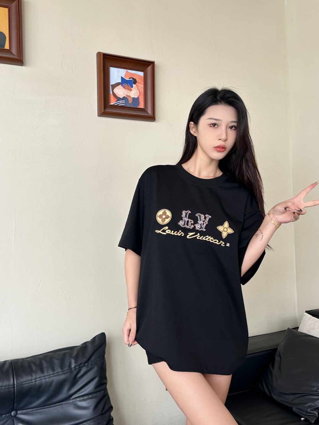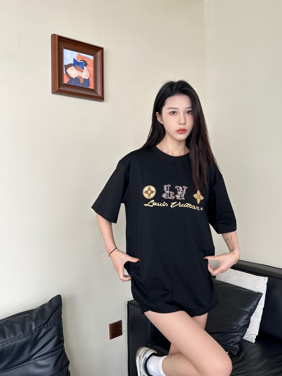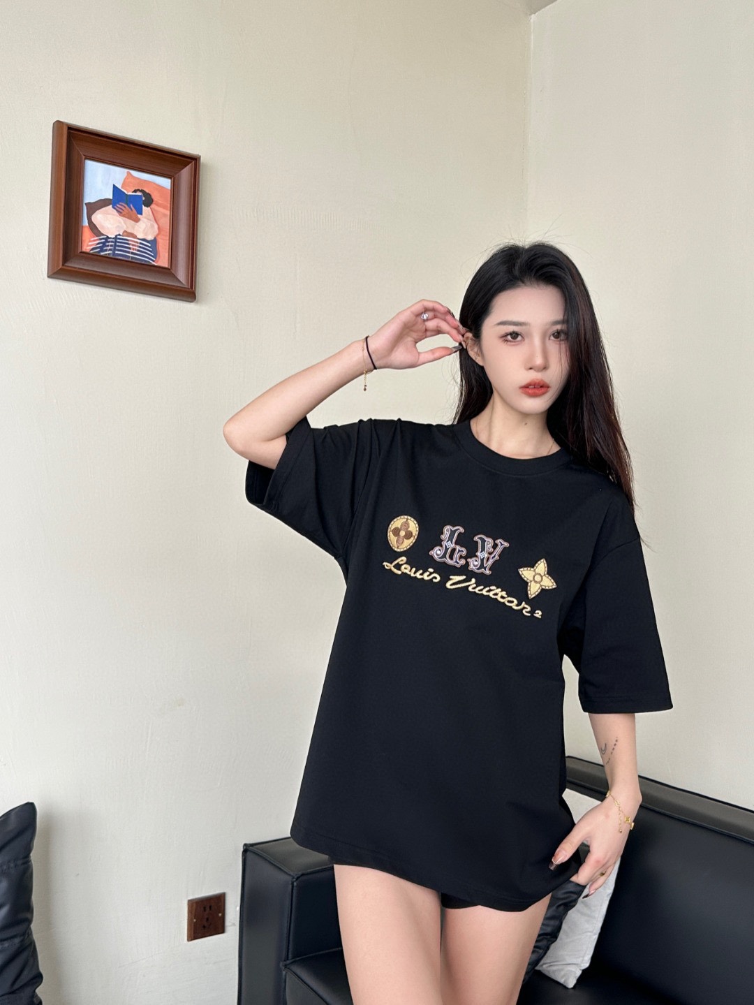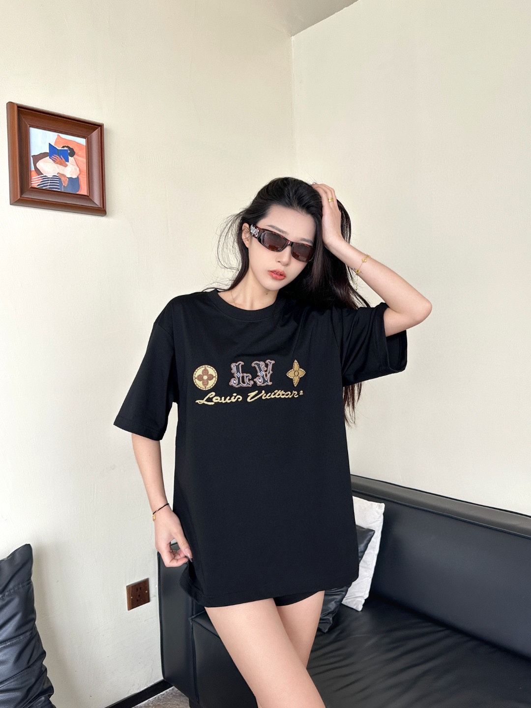 루이비통 시그니처 로고 네잎 클로버 자수 반팔 티셔츠-91446371