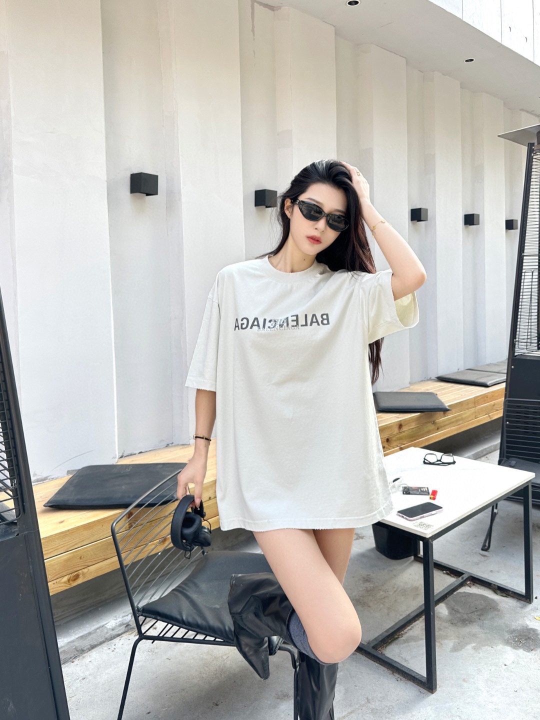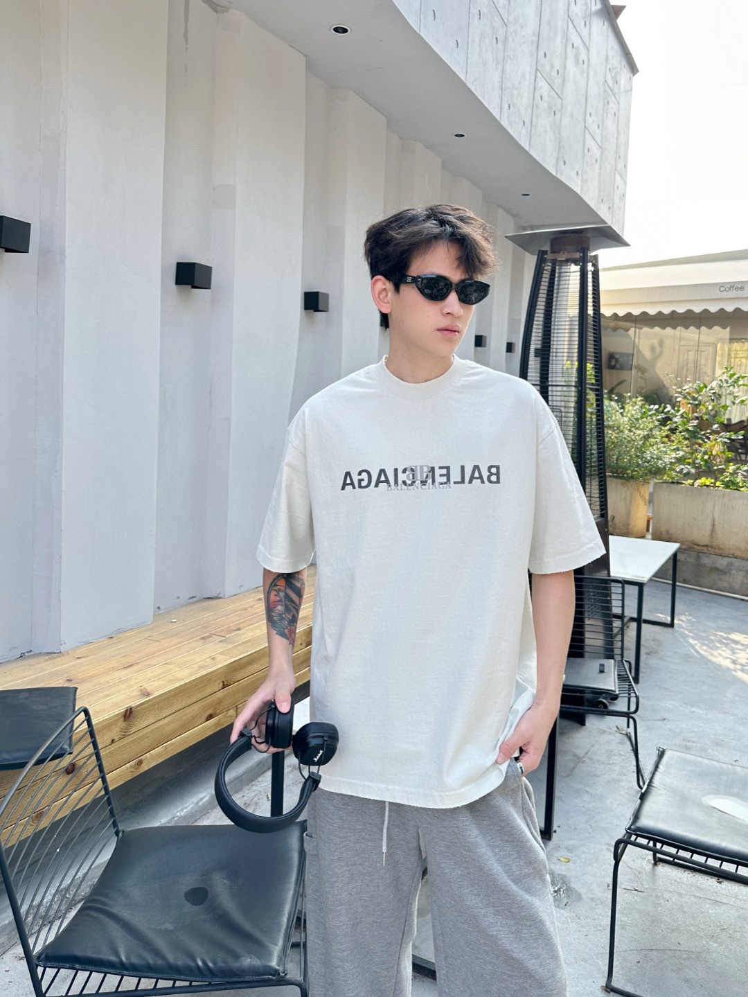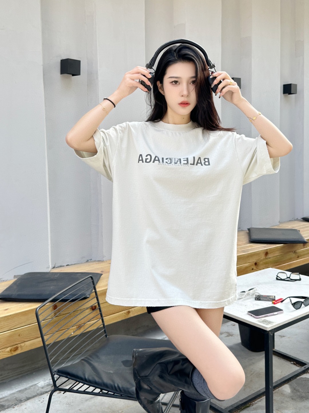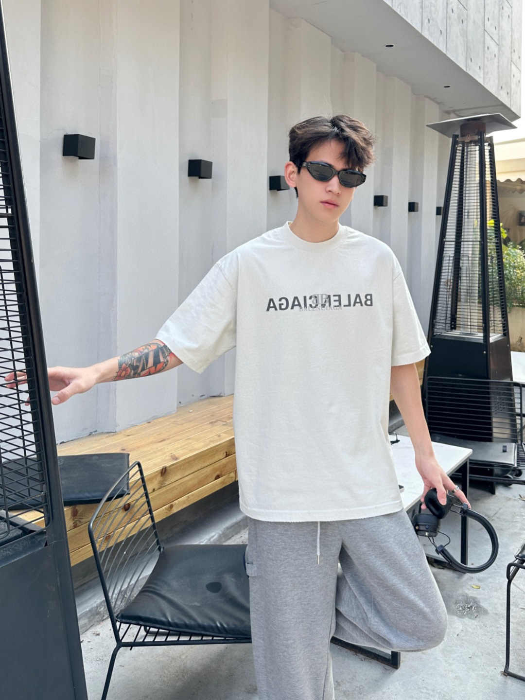 발렌시아가 리버스 레터 더블 B 프린트 워시드 리핑 반팔 티셔츠-89786312